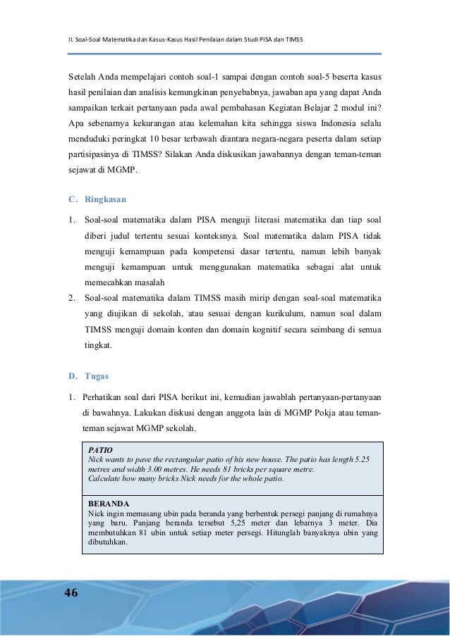 Contoh soal pisa bahasa indonesia guru paud soal uts matematika kelas 6 sd semester 2 genap dan. Booking.com has been visited by 1m+ users in the past month Ada soal pisa mtri spldv ngk? Kl ada blh bagi link nya donk.thanks. Booking.com has been visited by 1m+ users in the past month Tingkat kesulitan soal dalam un 2014 terdiri dari 20 persen soal susah, 70 persen soal sedang, dan 10 persen soal mudah. May 20, 2021 · contoh soal 1 pembahasannya. Oct 03, 2019 · inilah pembahasan lengkap terkait contoh soal matematika pisa dan penyelesaian. Kumpulan soal pisa matematika dan jawabannya. Oct 07, 2020 · kumpulan soal pisa matematika. Pisa (program for international student assessment) merupakan sebuah penilaian secara internasional yang diselenggarakan oleh oecd terhadap keterampilan dan kemampuan siswa usia 15 tahun (oecd, 2013; Book your hotel in pisa online. Info kangean november 19, 2019 at 3:52 am.